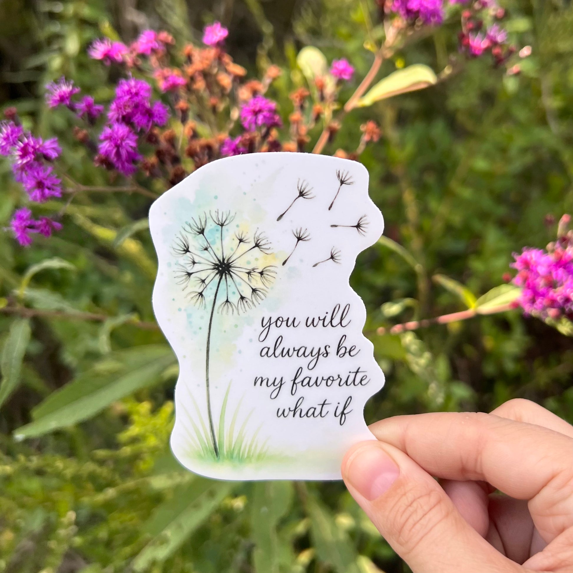 You Will Always Be My Favorite What If: A soft watercolor dandelion with seeds drifting away, symbolizing dreams and hopes carried on the wind.