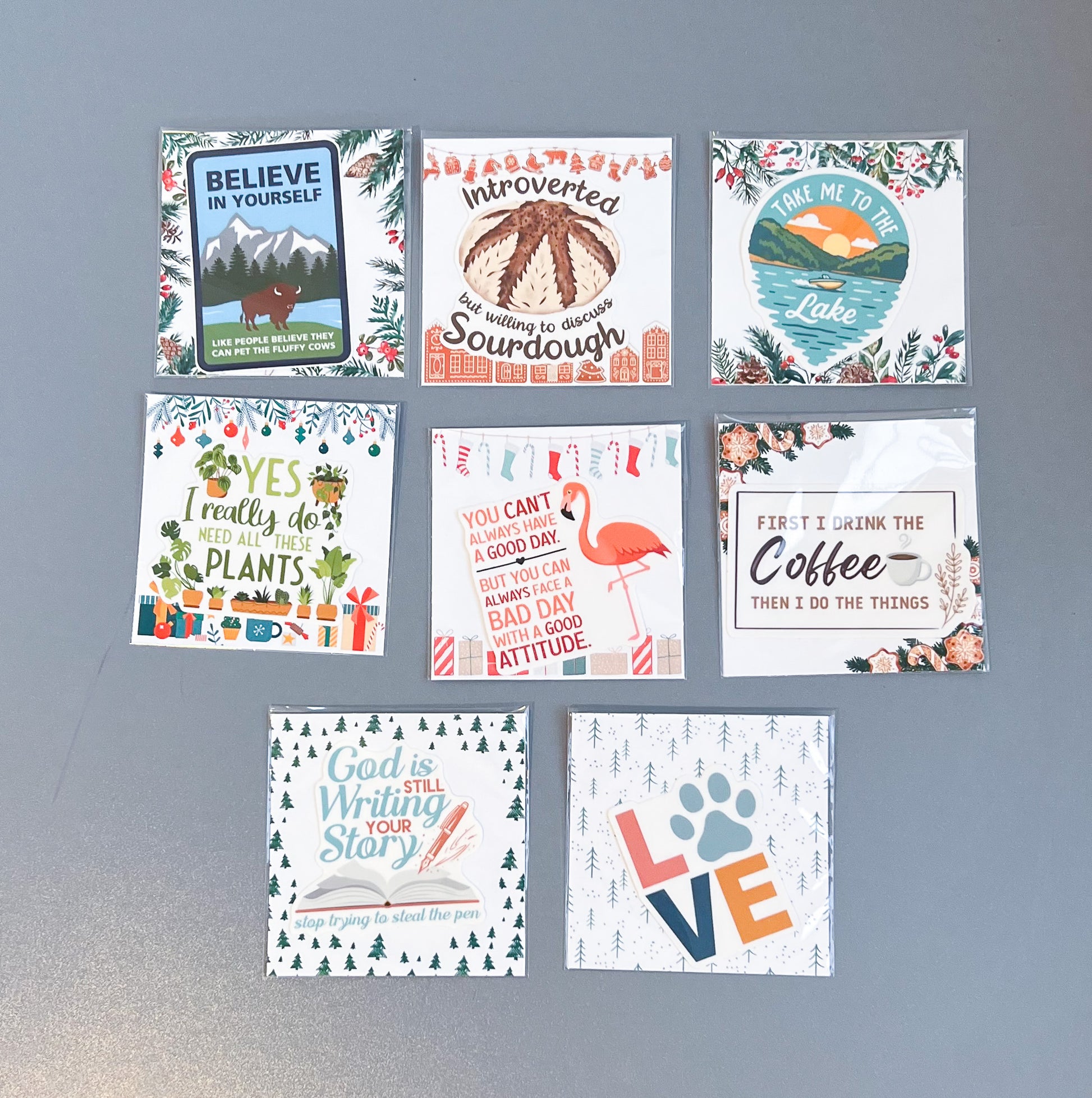 Inside, you’ll find eight of our favorite waterproof stickers (including two exclusive holiday designs), each individually wrapped with mini holiday cards — plus a stainless steel water bottle featuring a coordinating sticker design. It’s all beautifully presented in a keepsake holiday box, so your recipient can open it and feel instantly loved.