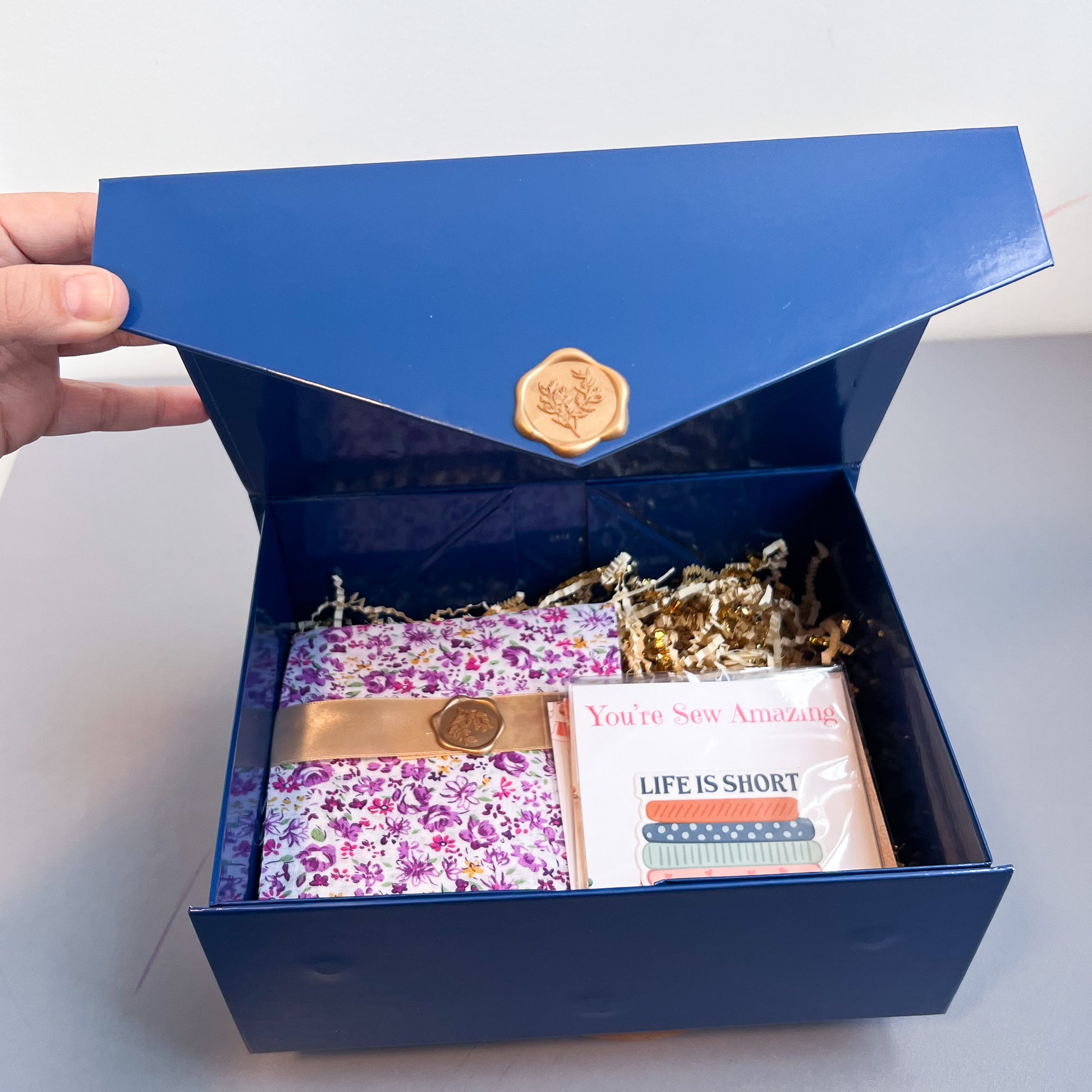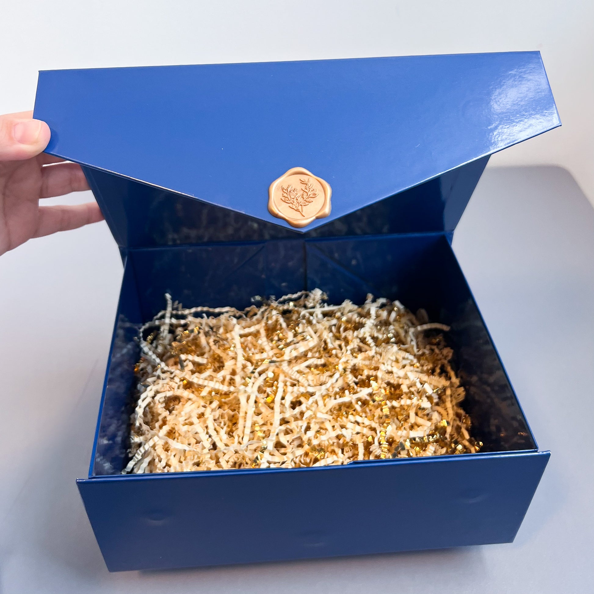 • Navy Holiday keepsake box with magnetic latch and gold wax seal with gold ribbon and gold crinkle paper. Also the Box is larger enough to add your own extra touches)